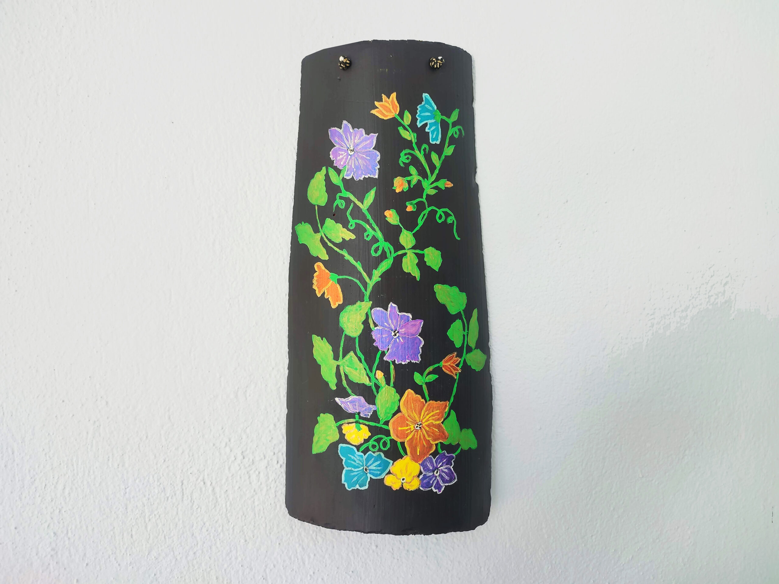The artist breathes life into the ancient clay, layering bold florals in hues of amethyst, sapphire, tangerine, and gold. Each blossom, entwined in a dance of curling green vines, evokes the harmony of a sunlit garden stirred awake by the gentle whisper of dawn.