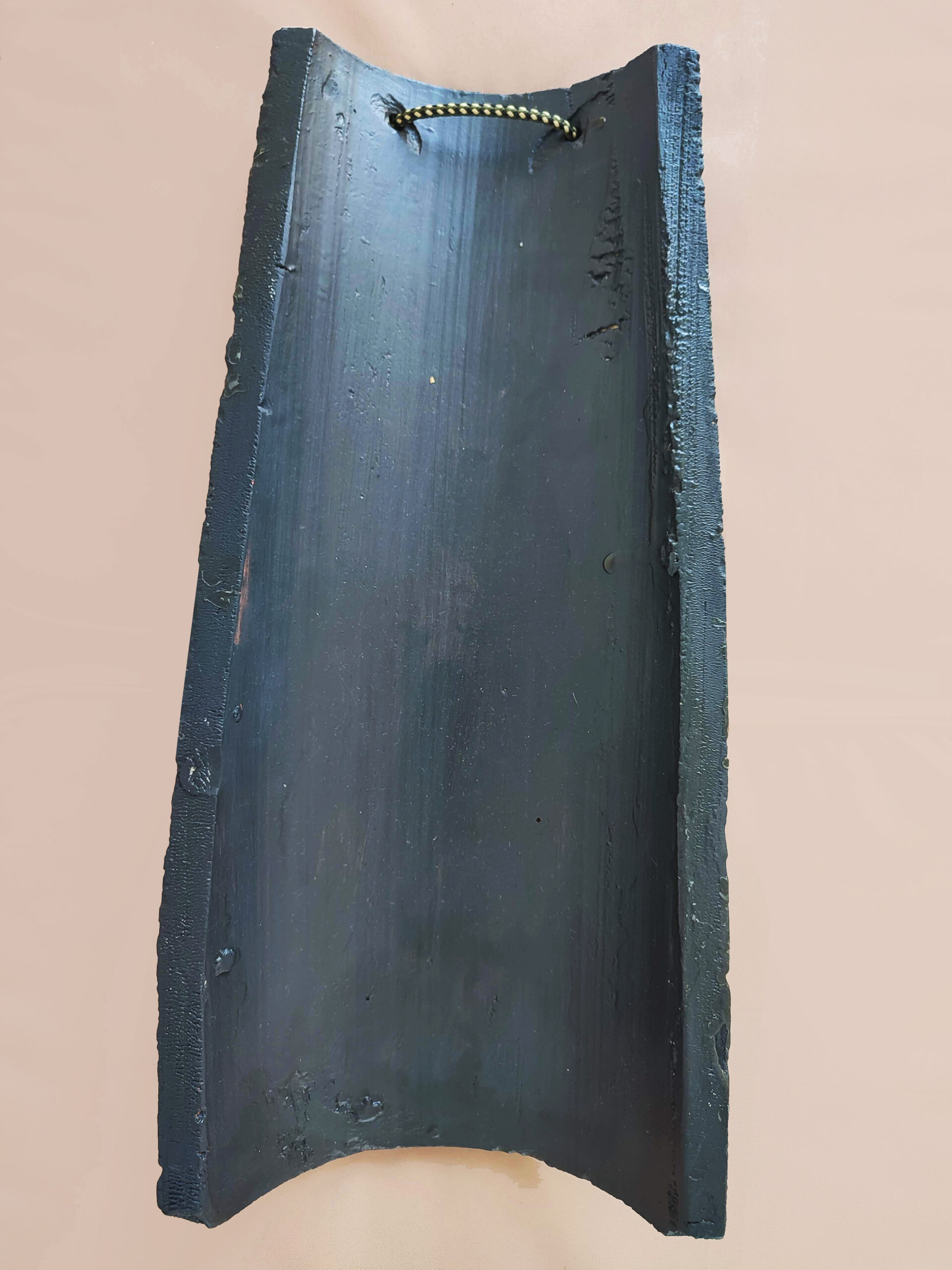 • Dimensions: The tile is 40 cm in length, 18.5 cm wide at the bottom tapering to 15 cm at the top and 6 cm deep. There is a strong cord tied from the holes from which the tile can hang (see photos). It weighs 1.546 kg.