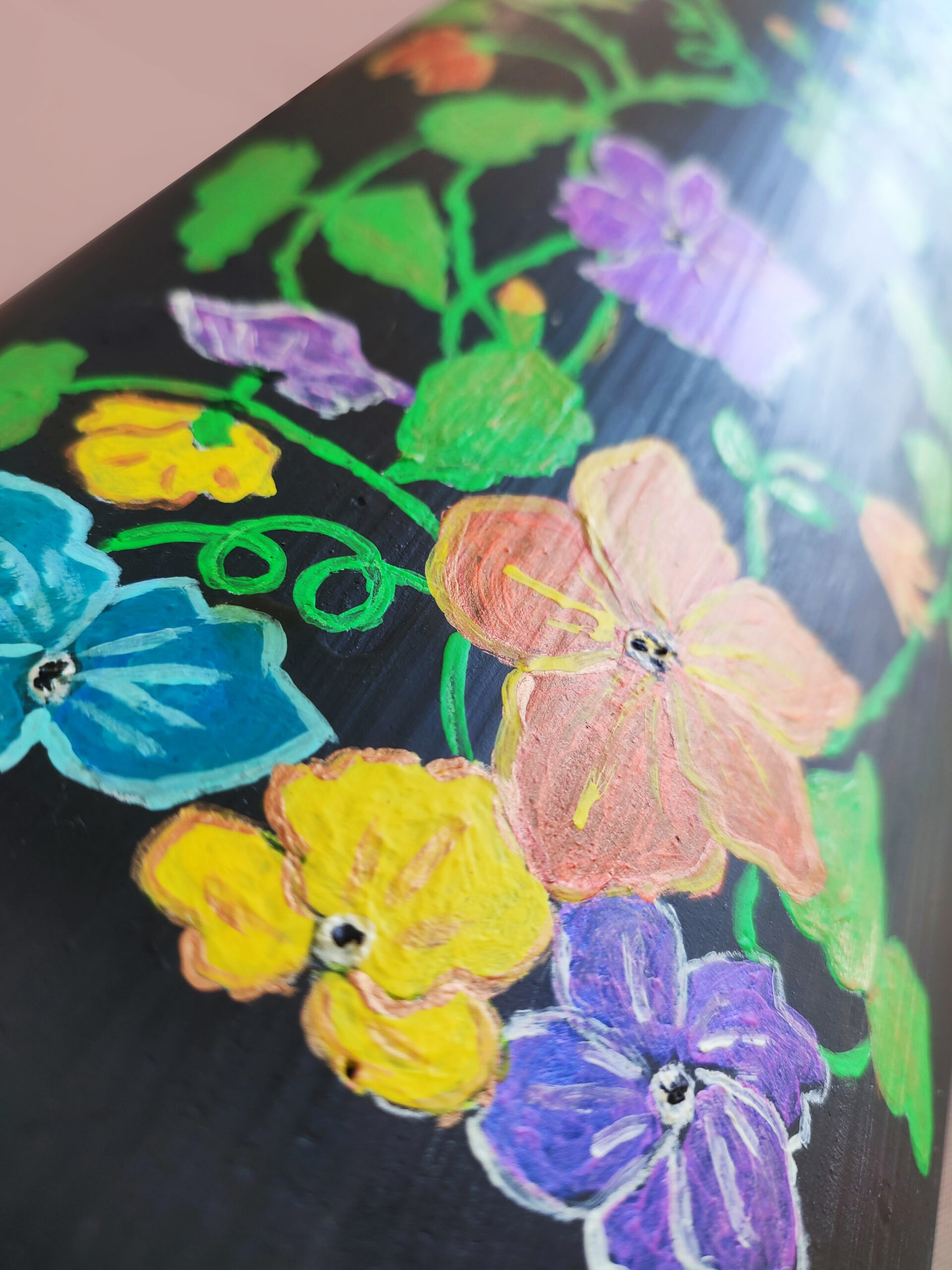 The black base of the aged ceramic serves as a dramatic contrast to the lively floral composition, emphasizing the timelessness of renewal—an eternal bloom, held in hand-painted form.