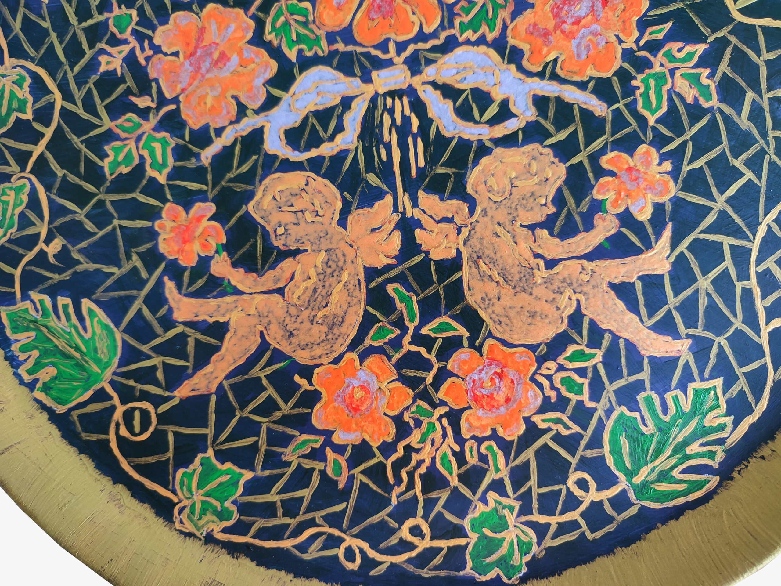 At its heart, two cherubic figures swing gently from intertwining vines, cradled in a blooming garland of coral and peach blossoms. Their forms are soft, their gestures serene, as if suspended in a moment untouched by time. The background—a deep, night-sky blue—is veined with fine golden latticework, evoking both Byzantine mosaics and the sacred geometries of old-world art.